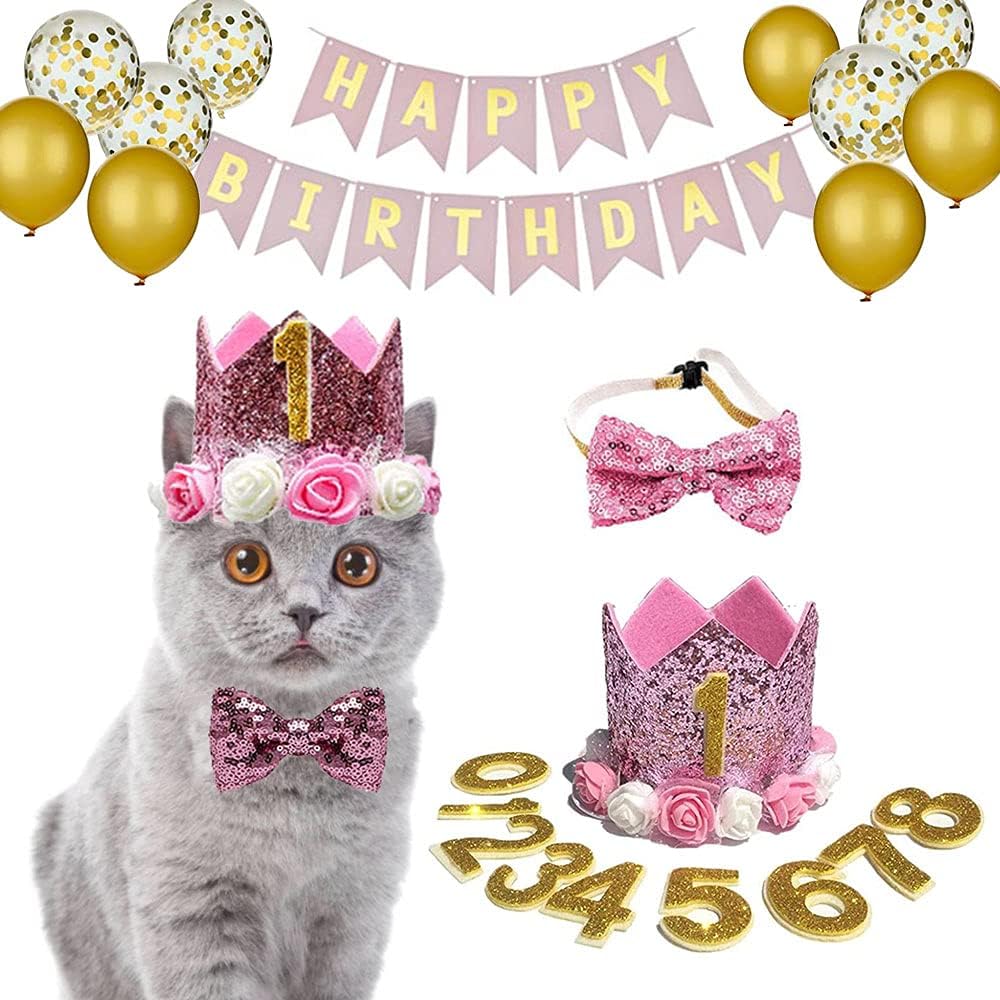 ペット 誕生日帽子 クラウン 蝶ネクタイ 犬 猫 王冠 数字付き キラキラ ピンク ガーランド セット 写真映え お1人様1点限り パーティー飾り 風船 誕生日グッズ 撮影